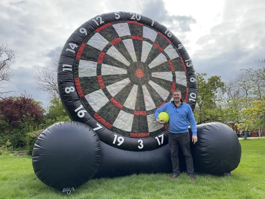 Our giant 4-metre Velcro Dartboard adds an exciting twist to football challenges, inflatable football games, and velcro football competitions. Suitable for older kids, teenagers, and adults, it’s ideal for birthday parties, school sports days, village fetes, and corporate team-building events in Bedford, Wootton, Keysoe, Kimbolton, Broom, Great Barford, and surrounding villages.