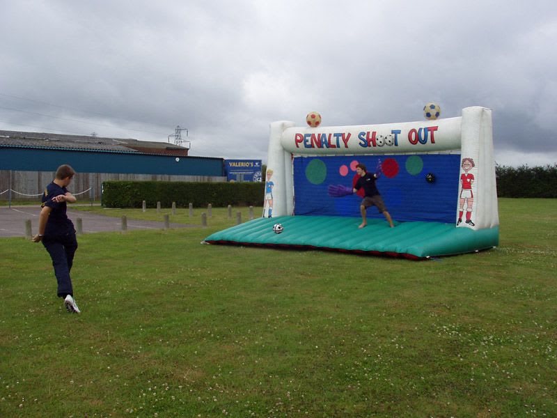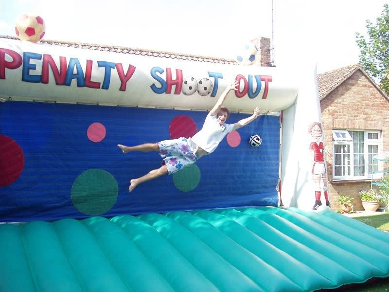 Perfect your goalie dive without the bruising by hiring this giant inflatable velcro penalty shoot out.
